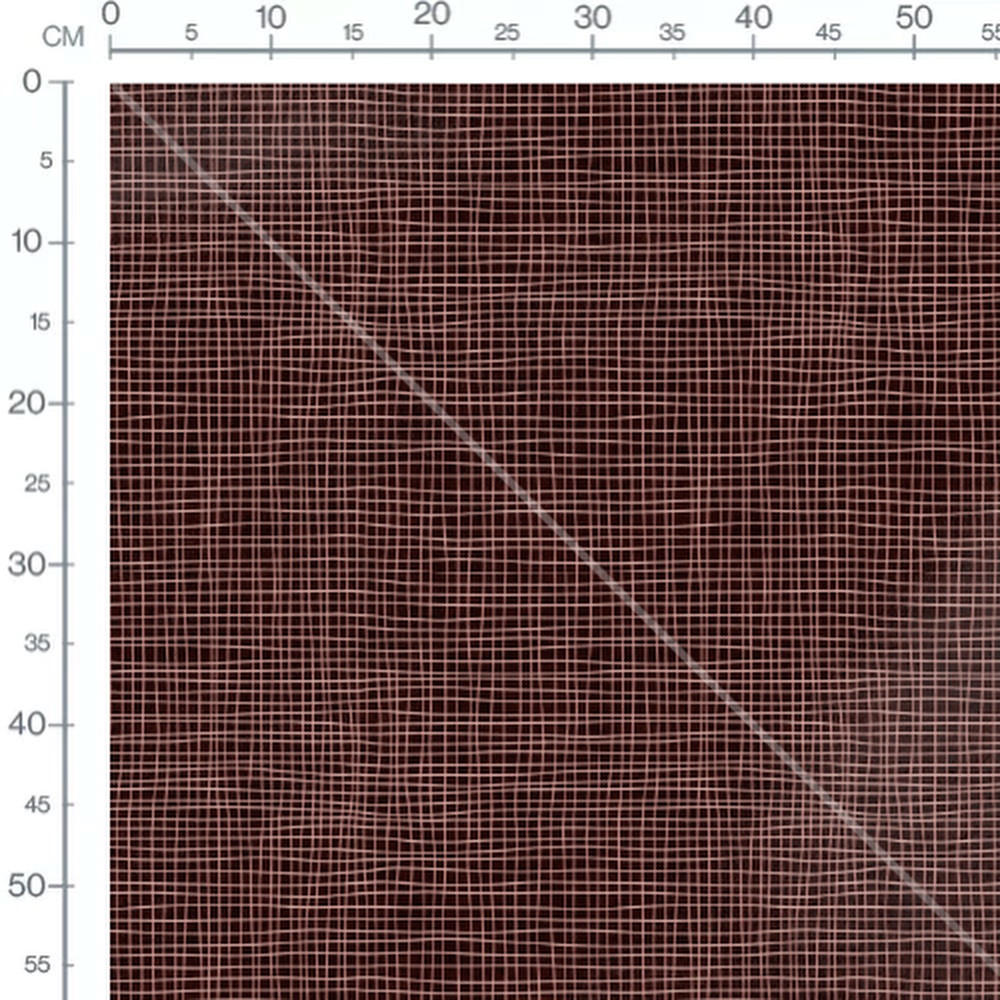 Les carreaux sont formés par des lignes roses fines et ondulées. Le fond marron foncé crée un contraste avec les lignes claires.Les tissus