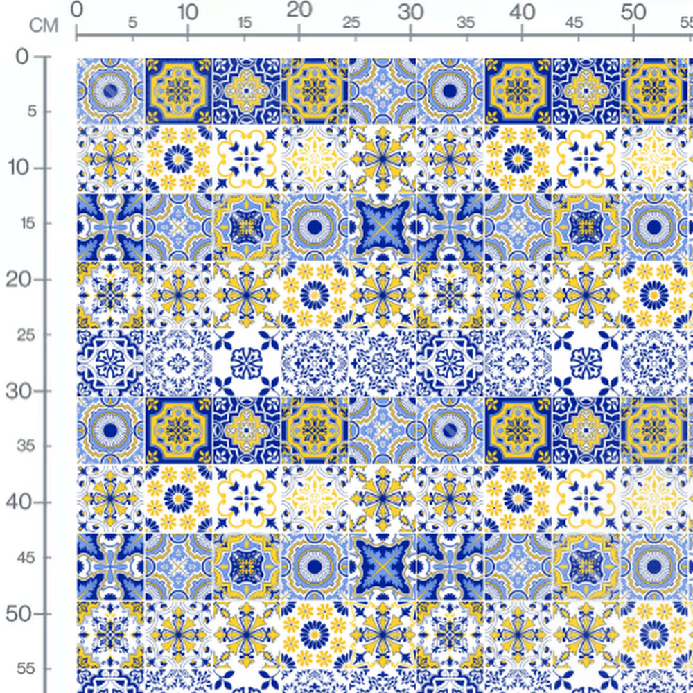 Les motifs incluent des formes florales et des arabesques complexes. Les couleurs principales sont le bleu, le jaune et le blanc. Chaque carreau présente un design unique avec des détails géométriques. Les motifs sont inspirés des carreaux traditionnels portugais.Les tissus