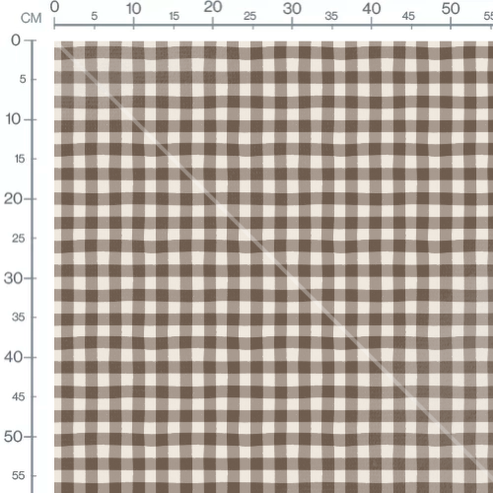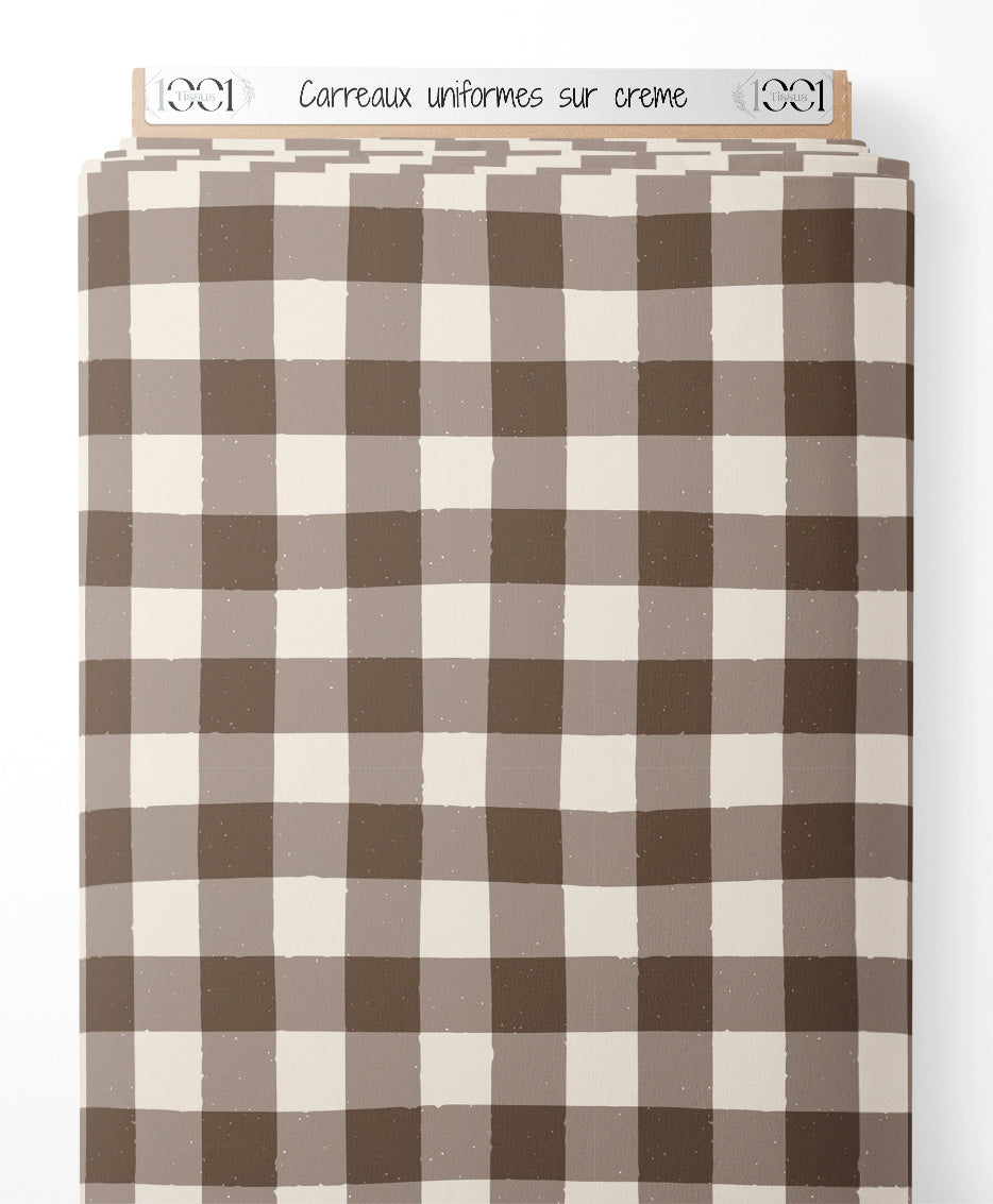 Les carreaux sont de taille uniforme et alternent entre marron et beige. Le fond crème met en valeur le contraste des couleurs. Le motif est classique et intemporel.Les tissus