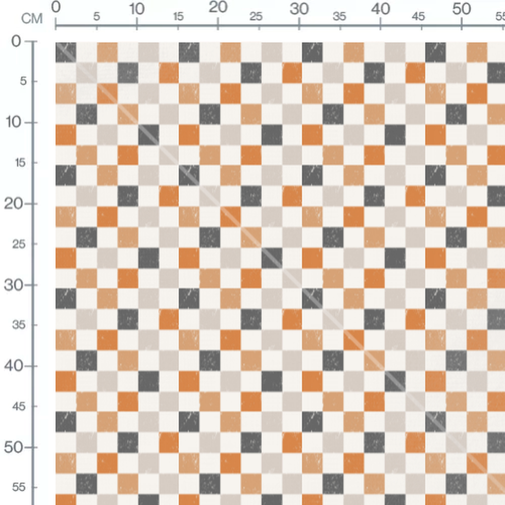 Les carreaux présentent un aspect vieilli avec des teintes variées. L'effet usé donne un style rétro au motif. Les couleurs incluent des nuances de gris, orange et beige.Les tissus