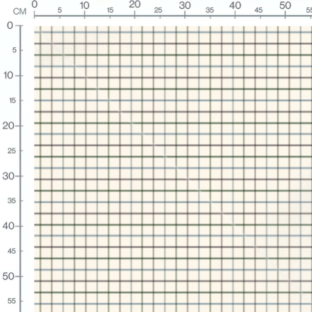 Les lignes forment un motif de grille régulière. Les couleurs des lignes incluent le vert, le bleu et le gris, créant un contraste subtil avec le fond beige.Les tissus