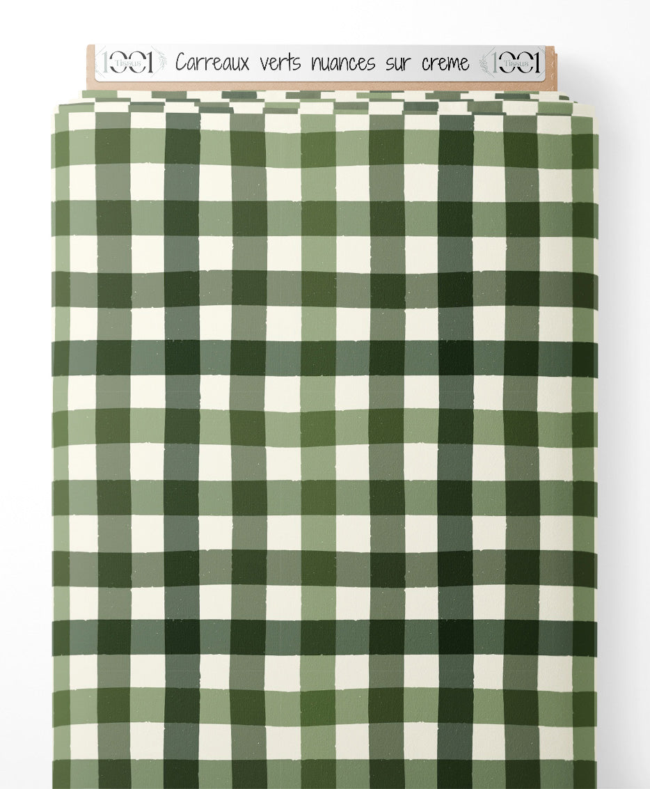 Tissu - Carreaux verts nuancés sur crème