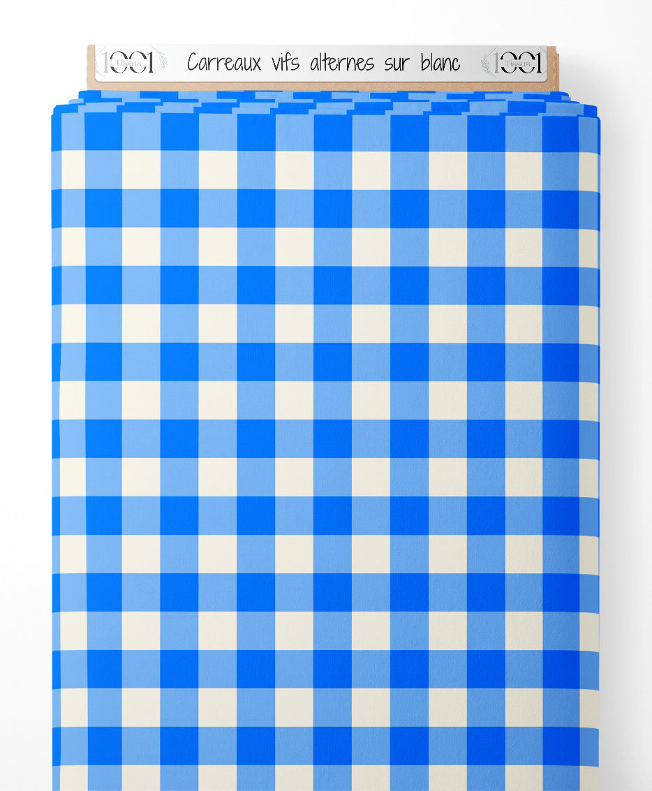 Les carreaux sont de taille uniforme et alternent entre le bleu vif et le blanc. Le motif crée un effet visuel classique et intemporel.Les tissus