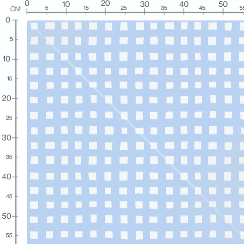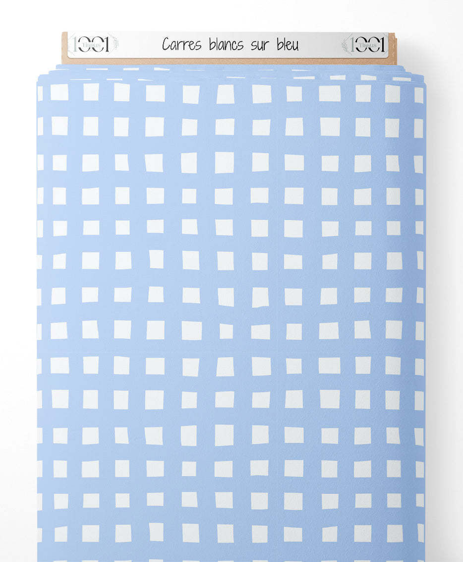 Les carrés sont de tailles légèrement variées et disposés de manière régulière. Le fond bleu clair met en valeur les carrés blancs. Ce motif géométrique apporte une touche moderne et épurée.Les tissus