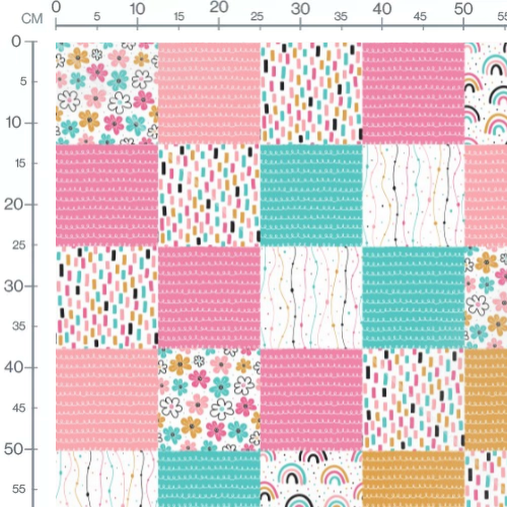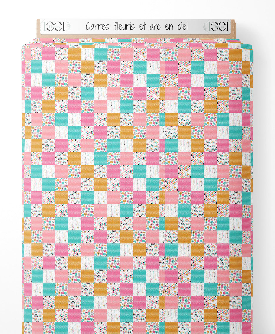 Les carrés présentent des motifs de fleurs colorées et des arcs-en-ciel. Des lignes et des points multicolores complètent le motif sur certains carrés.Les tissus
