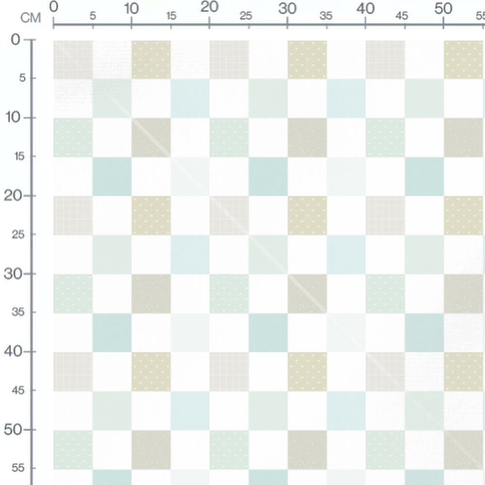 Certains carrés présentent des motifs de petits cœurs blancs sur fond beige. D'autres carrés sont unis ou avec des lignes fines sur fond bleu clair.Les tissus