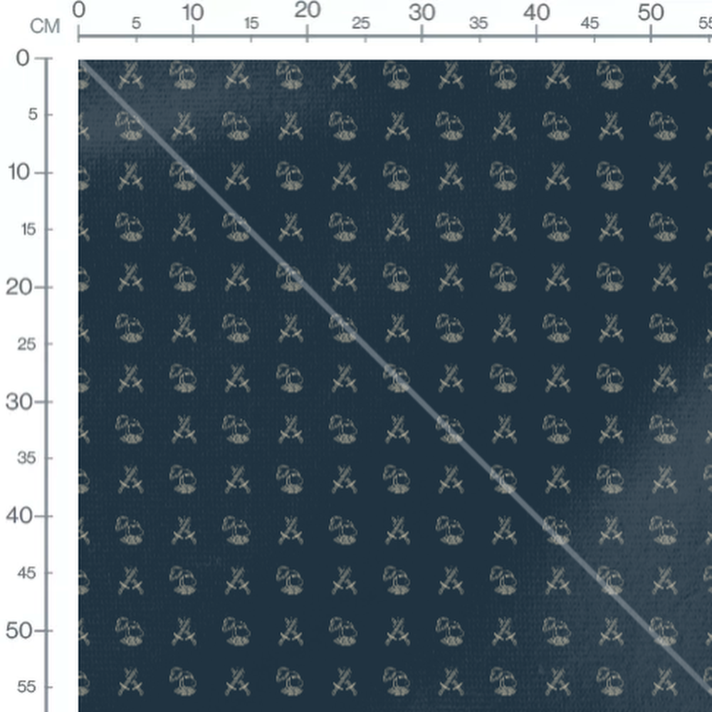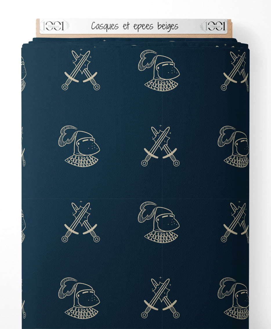 Les casques de chevaliers sont détaillés avec des visières et des motifs de mailles. Les épées croisées sont simples avec des poignées visibles.Les tissus