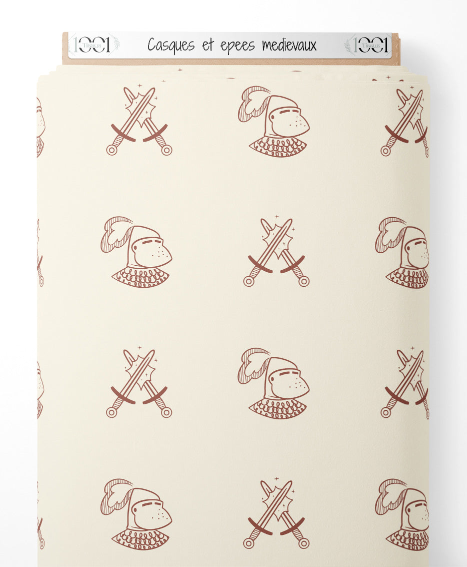 Les casques de chevaliers sont dessinés avec des détails simples. Les épées croisées ajoutent une touche médiévale au motif.Les tissus