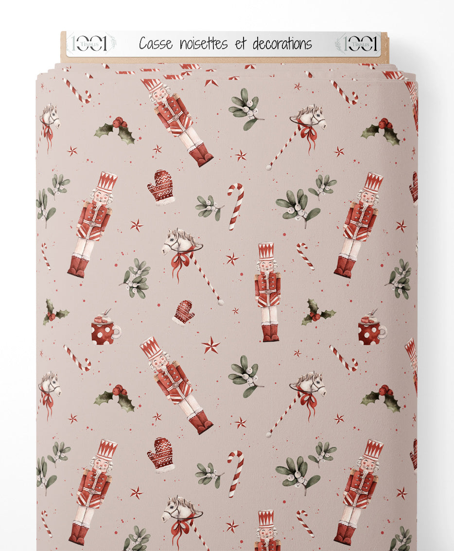 Les casse-noisettes sont accompagnés de branches de gui et de houx. Des cannes à sucre rayées rouges et blanches ajoutent une touche festive. Des chevaux blancs ornés de rubans rouges et des moufles rouges complètent le thème hivernal. Des étoiles rouges parsèment le fond beige.Les tissus