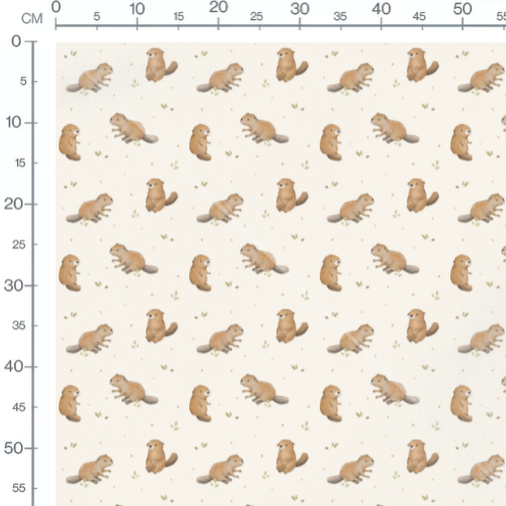 Les castors sont dessinés dans des positions variées. Les feuilles vertes ajoutent une touche naturelle. Les points colorés varient entre le beige et le brun.Les tissus