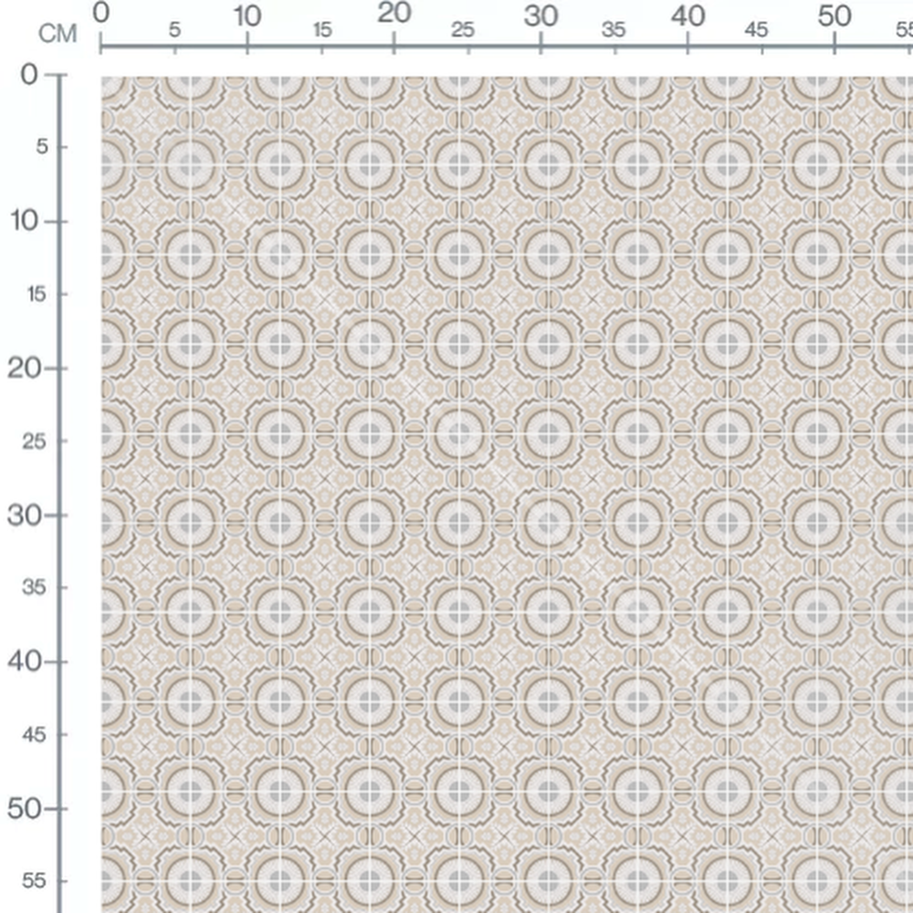 Les cercles sont entourés de lignes entrelacées formant un motif complexe. Les couleurs beige et gris créent un effet harmonieux. Le design est symétrique et répété uniformément.Les tissus