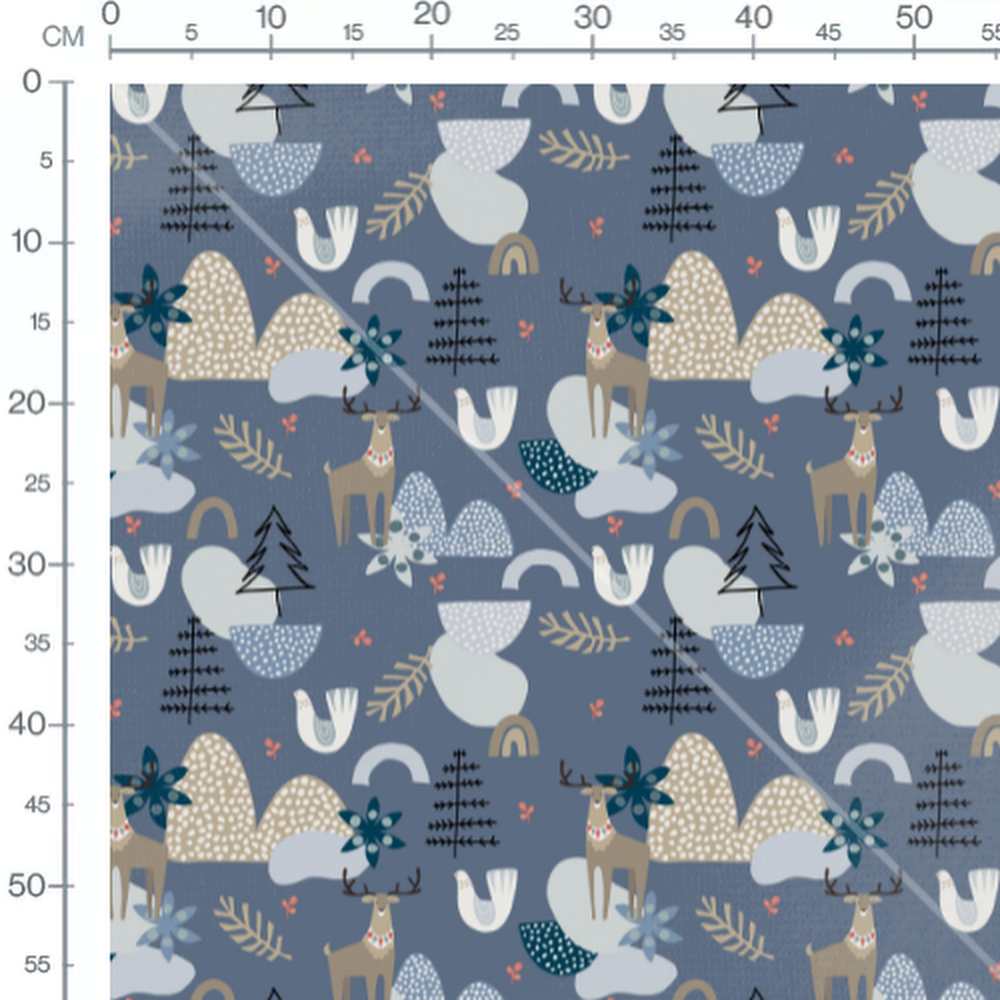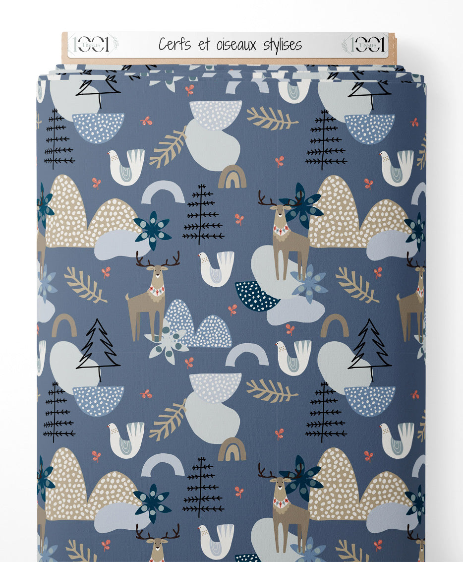Les cerfs portent des motifs colorés autour du cou. Les oiseaux sont entourés de petites fleurs et de feuilles. Les montagnes sont ornées de motifs en pointillés. Des arcs et des formes géométriques complètent le design.Les tissus