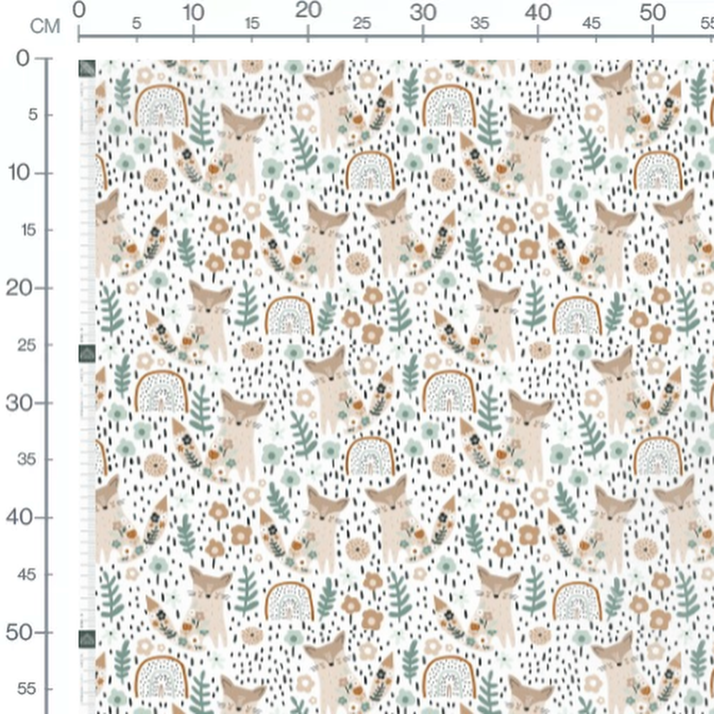 Des champignons rouges et blancs parsèment le motif. Des fleurs roses et bleues ajoutent une touche de couleur. Les feuilles vertes et brunes créent un cadre naturel.Les tissus