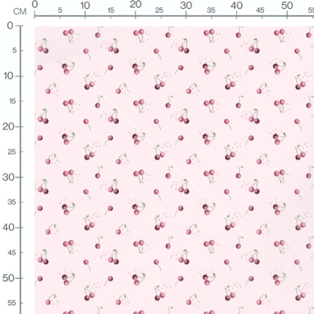 Les cerises sont de différentes nuances de rose, allant du clair au foncé. Les feuilles sont d'un vert doux, ajoutant une touche de contraste. Les points roses autour des cerises créent un effet délicat et ludique.Les tissus