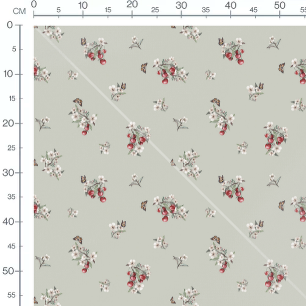 Les cerises sont accompagnées de petites fleurs blanches délicates. Les papillons ajoutent une touche de couleur vive au motif. Le fond vert pâle met en valeur les éléments naturels.Les tissus