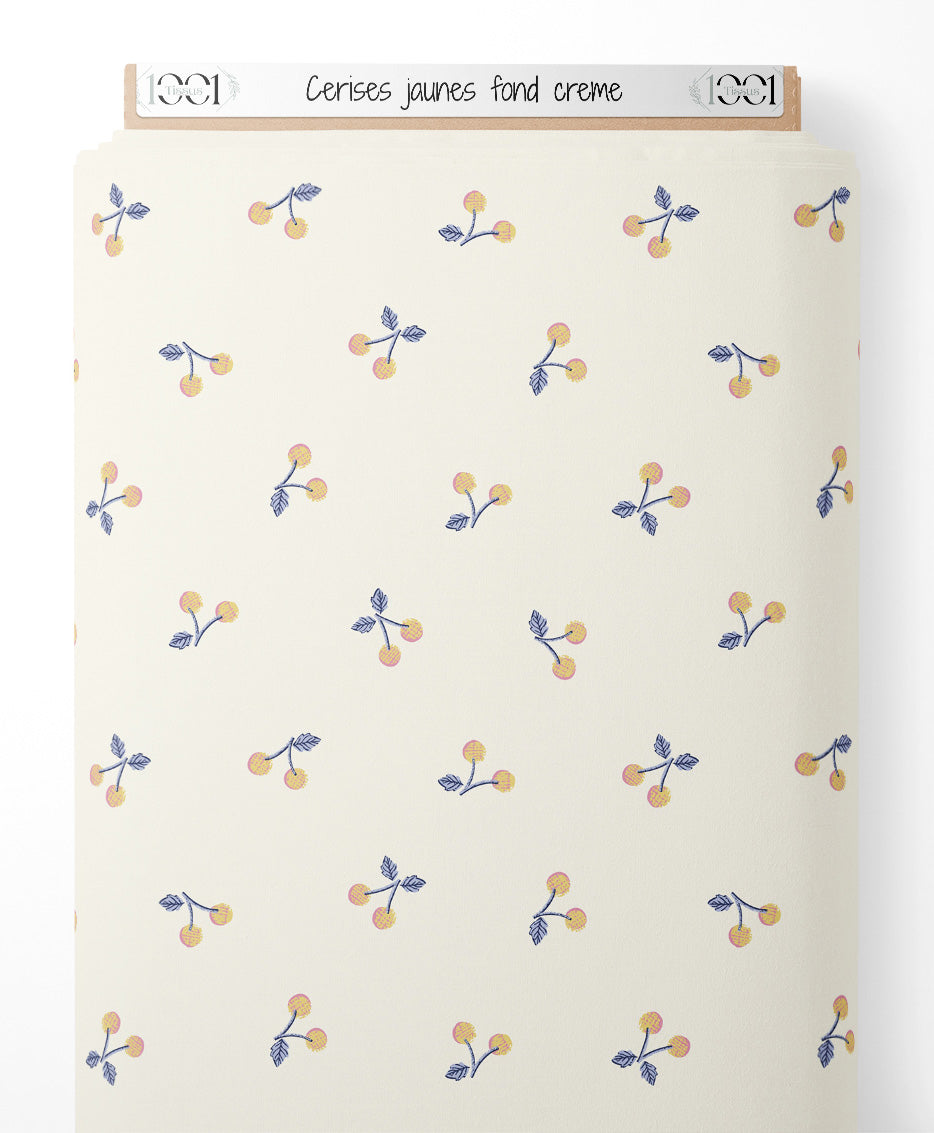 Les cerises sont de couleur jaune avec une légère teinte rosée. Les feuilles sont d'un bleu vif, ajoutant un contraste subtil au motif.Les tissus