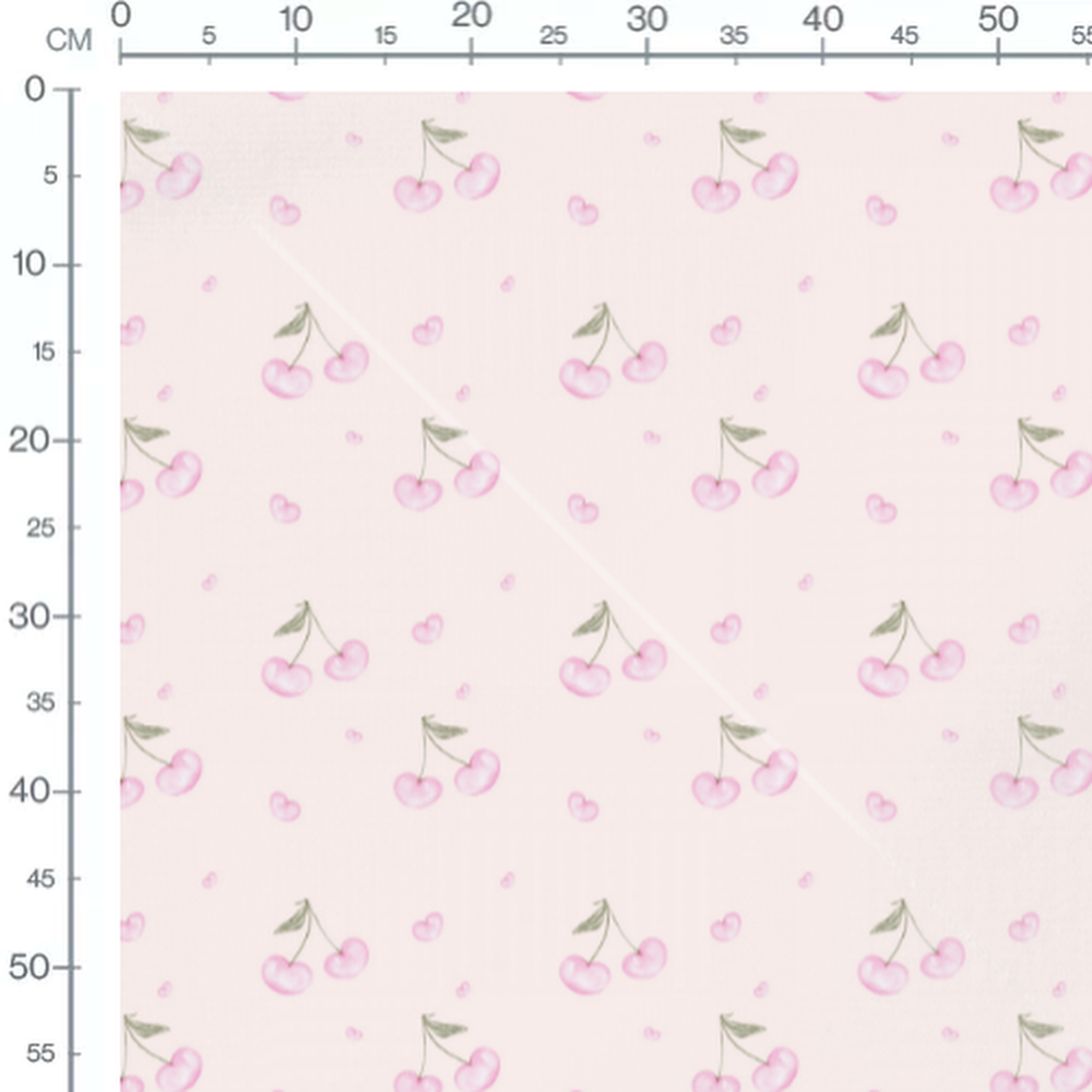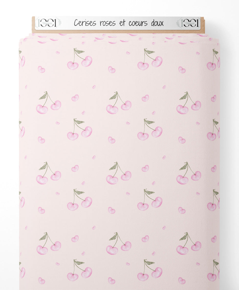 Les cerises sont dessinées avec des nuances de rose doux. Les feuilles sont d'un vert subtil, ajoutant une touche naturelle. De petits cœurs roses complètent le motif délicat.Les tissus