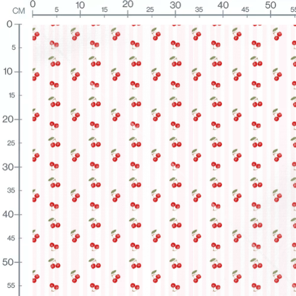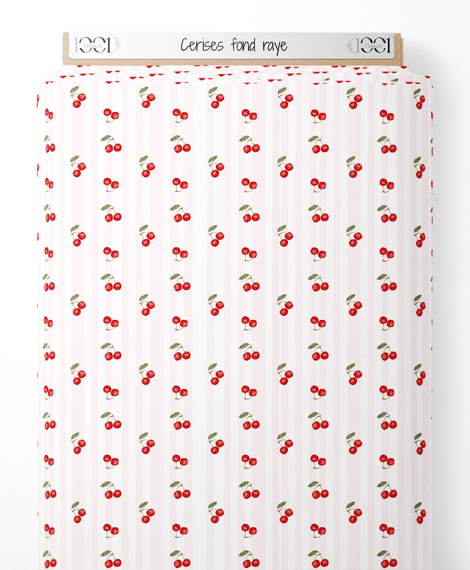 Les cerises sont disposées par paires avec des feuilles vertes. Le fond présente des rayures verticales roses et blanches, ajoutant une touche douce au motif.Les tissus