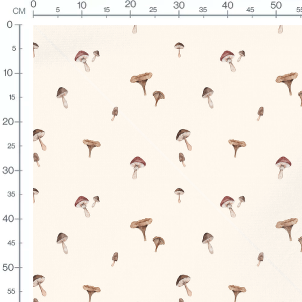 Les champignons sont peints dans des tons naturels de brun et de rouge. Chaque champignon présente des détails distincts, ajoutant de la variété au motif.Les tissus