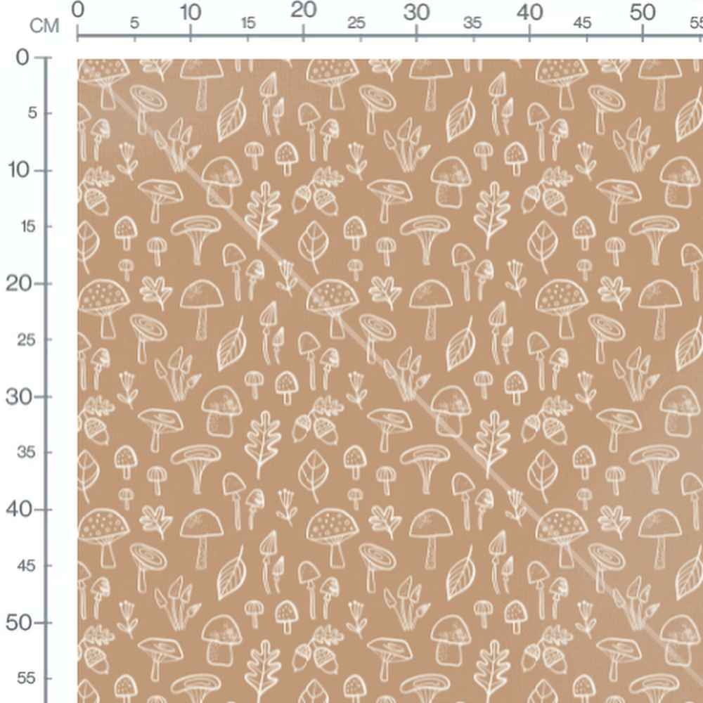 Les champignons sont variés avec des formes rondes et allongées. Les feuilles sont stylisées et accompagnent les champignons. Le fond marron met en valeur les dessins blancs.Les tissus