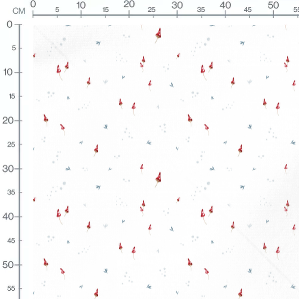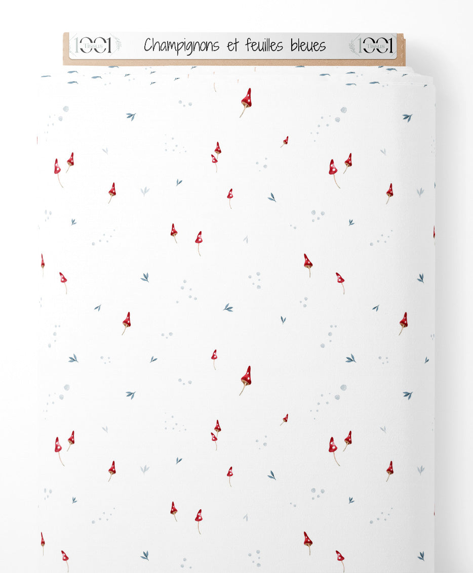 Les champignons ont des chapeaux rouges avec des tiges fines. Les feuilles bleues et les points gris ajoutent des détails subtils au motif.Les tissus