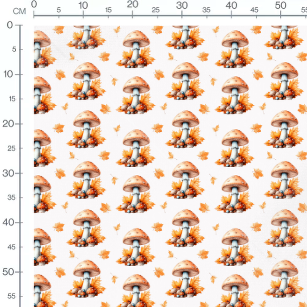 Les champignons sont de différentes tailles et couleurs, principalement orange et beige. Les feuilles d'érable sont d'un orange vif, ajoutant une touche automnale au motif.Les tissus