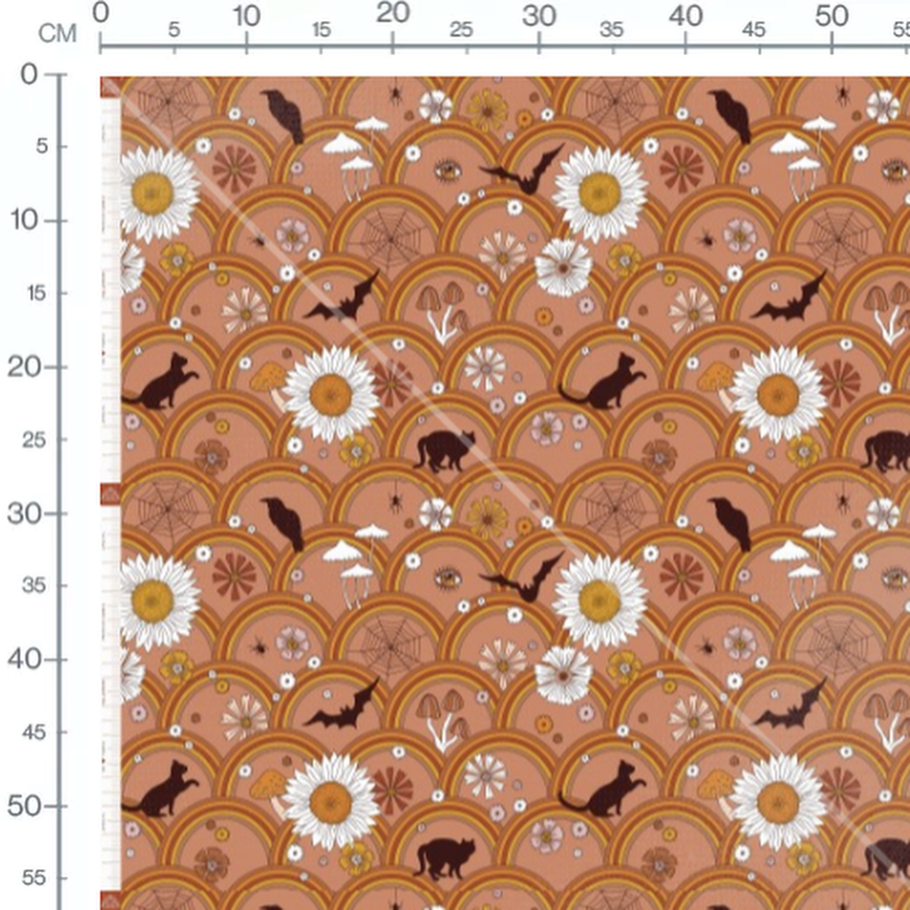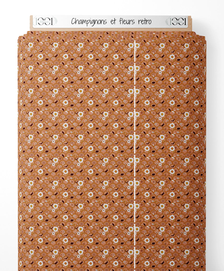 Les champignons sont disposés parmi de grandes fleurs blanches. De petits animaux noirs se détachent sur le fond brun. Des motifs géométriques complètent le design.Les tissus