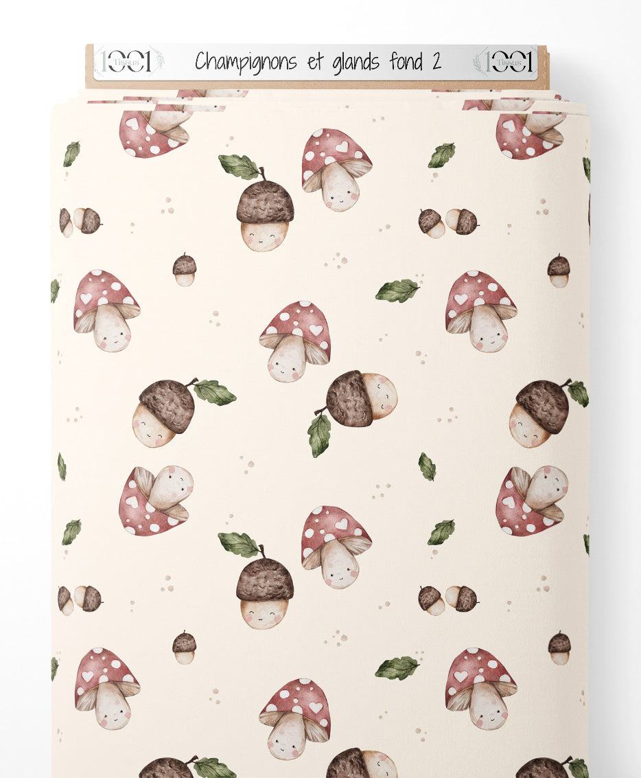 Les champignons ont des petits cœurs blancs sur leurs chapeaux rouges. Les glands sont accompagnés de feuilles vertes. Les motifs sont espacés sur un fond beige clair.Les tissus