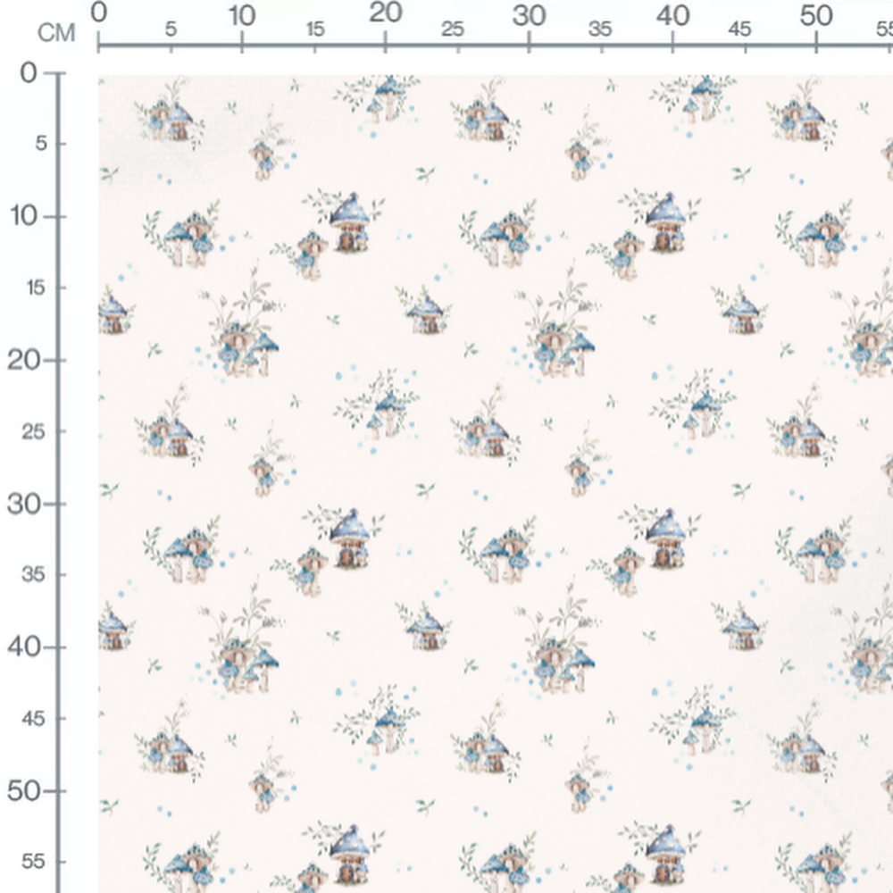 Les champignons sont de différentes tailles avec des chapeaux bleus. Les maisonnettes ont des toits en forme de champignon bleu. Des petites feuilles vertes et des points bleus ajoutent des détails autour des motifs principaux.Les tissus
