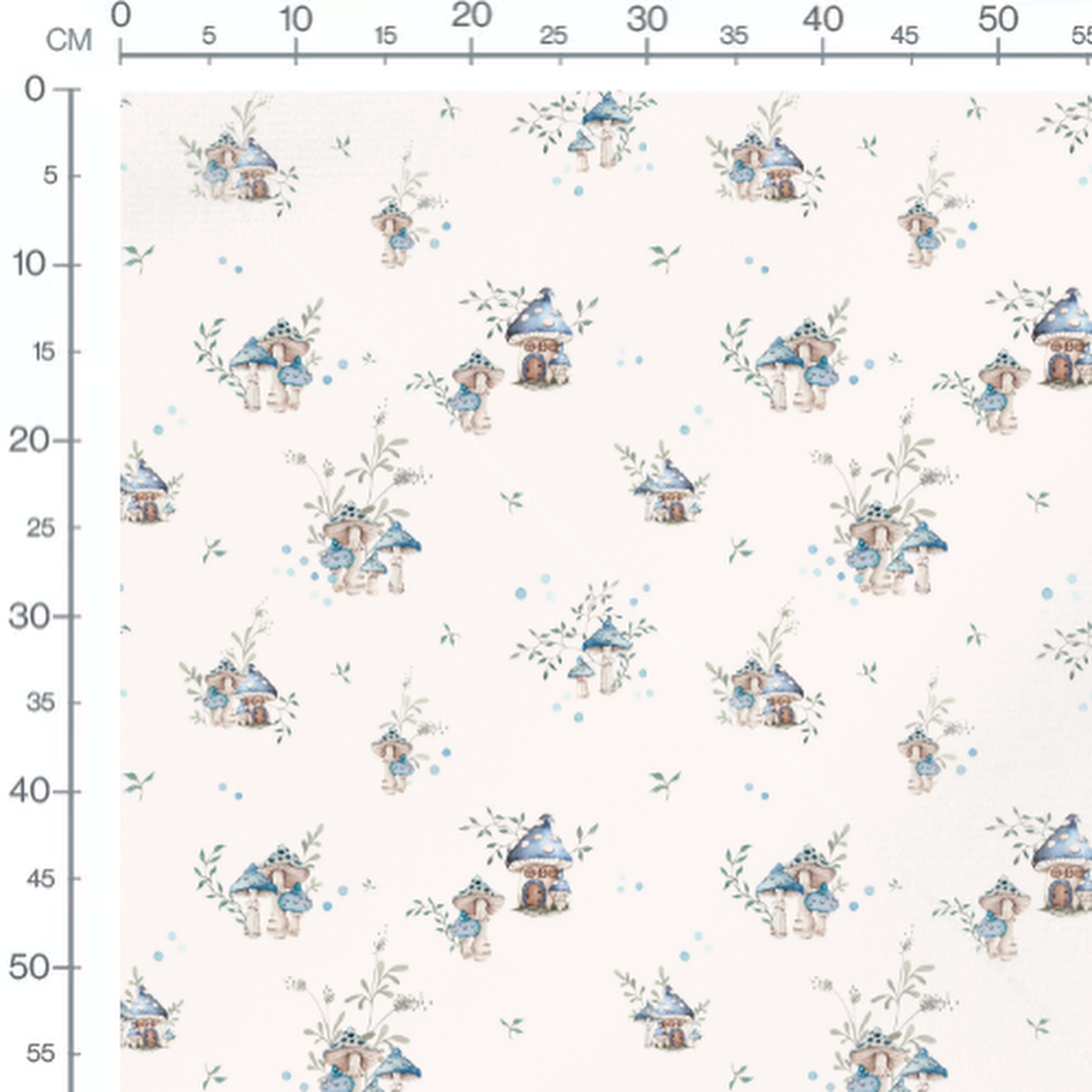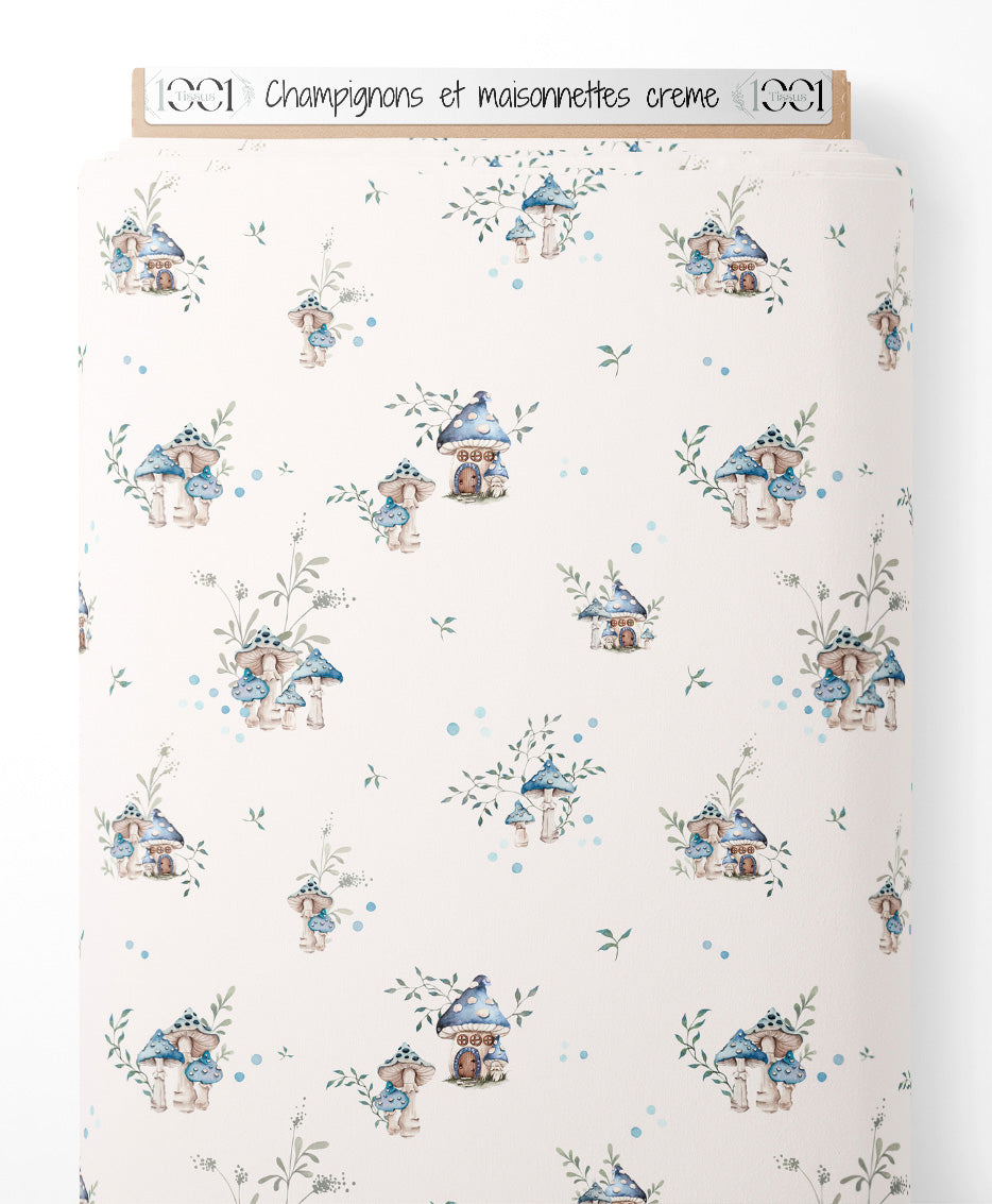 Les champignons sont ornés de petits détails et les maisonnettes ont des toits bleus. Des feuilles vertes et des points bleus ajoutent une touche de couleur. Le fond crème met en valeur les éléments du motif.Les tissus