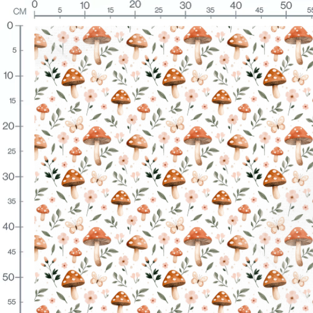 Les champignons sont de différentes tailles avec des tiges beige. Les papillons ont des motifs délicats sur leurs ailes. Les fleurs varient en taille et en teinte de rose. Les feuilles sont de différentes nuances de vert.Les tissus