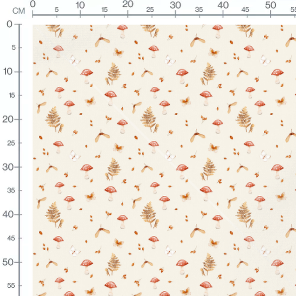 Les champignons rouges à pois blancs apportent une touche vive. Les papillons blancs ajoutent une légèreté au motif. Les feuilles et graines brunes complètent l'ensemble avec des nuances automnales.Les tissus