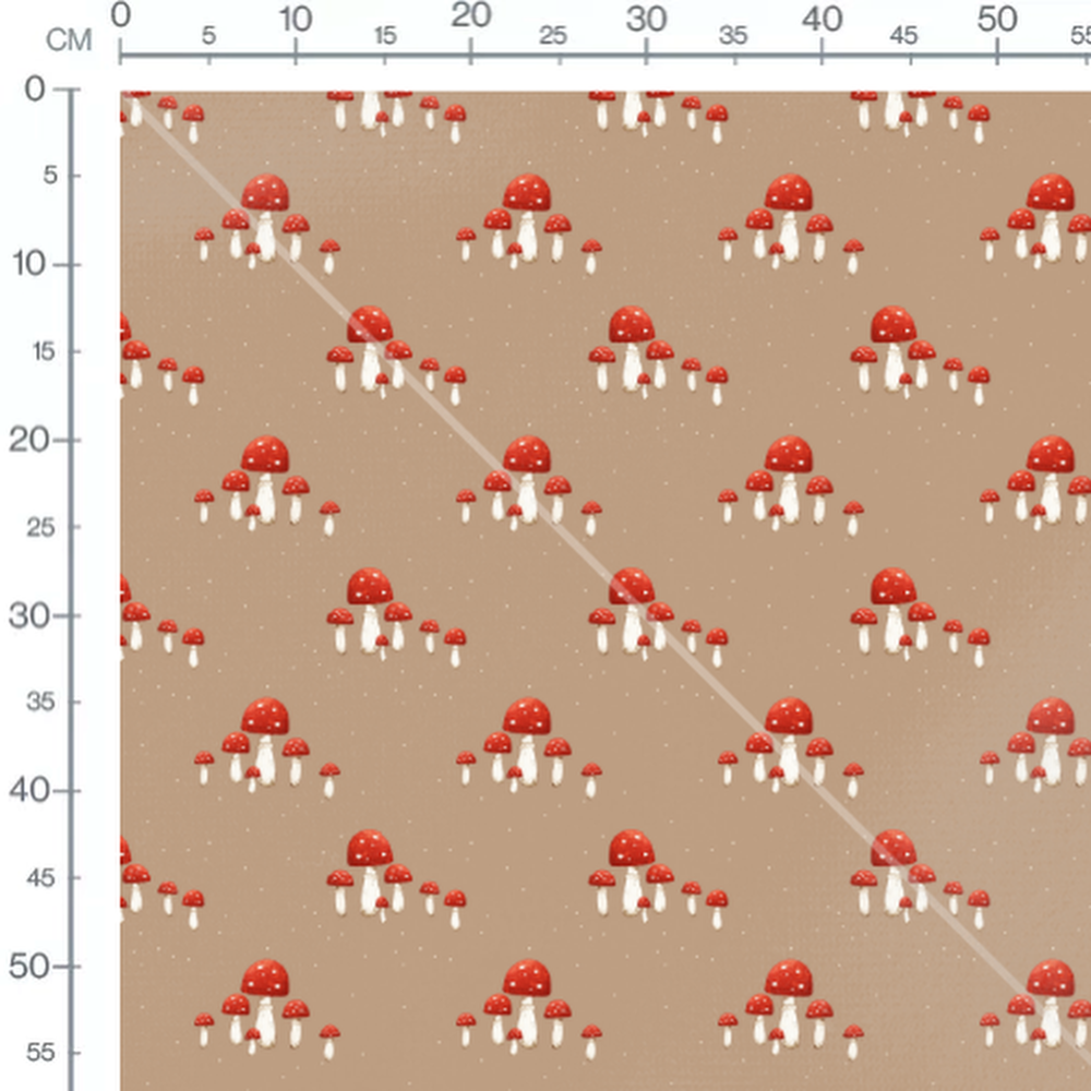 Les champignons ont des chapeaux rouges avec des pois blancs distincts. Le fond beige est parsemé de petits points blancs, ajoutant une texture subtile.Les tissus