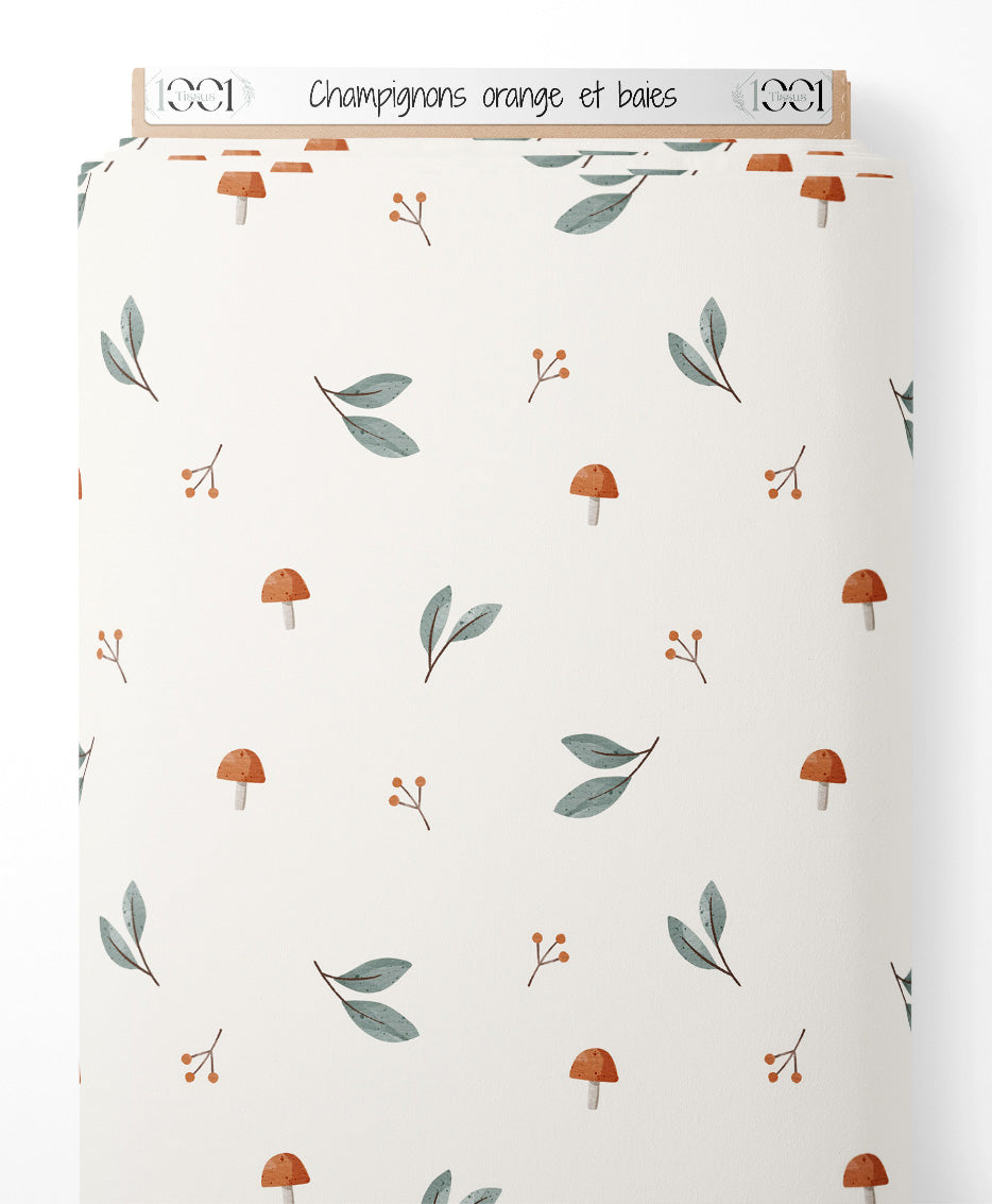 Les champignons sont de couleur orange avec des tiges blanches. Les feuilles sont vertes avec des détails fins. Les petites baies orange ajoutent une touche de couleur.Les tissus