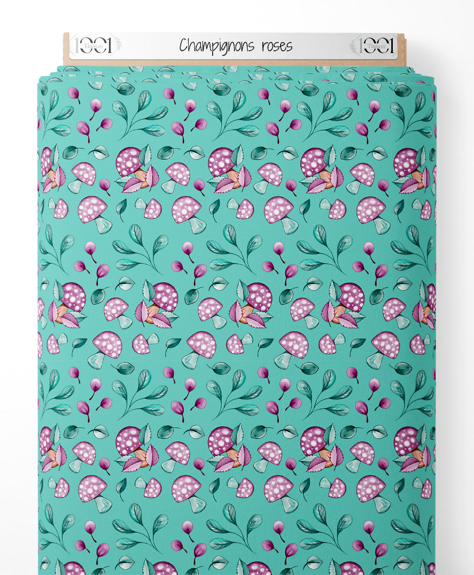 Les champignons sont entourés de feuilles aux teintes vertes variées. Les baies ajoutent une touche de couleur vive au motif. Les feuilles sont dessinées avec des détails délicats.Les tissus