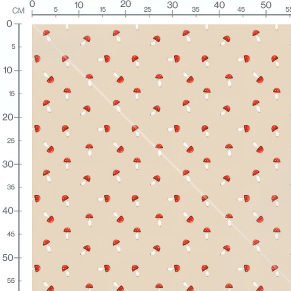 Les champignons ont des chapeaux rouges avec des pois blancs distincts. Les tiges des champignons sont blanches et contrastent avec le fond beige clair.Les tissus