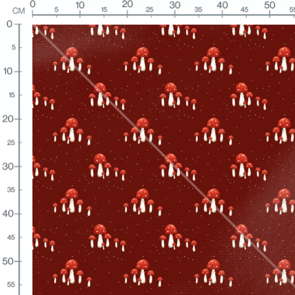 Les champignons ont des chapeaux rouges avec des pois blancs distincts. Le fond brun met en valeur les couleurs vives des champignons. Les petits points blancs ajoutent une touche de contraste au motif.Les tissus