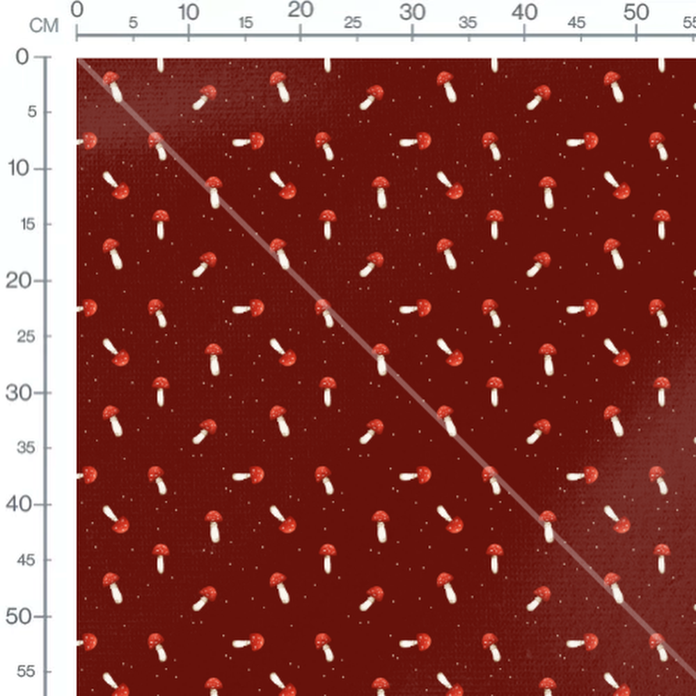 Les champignons sont de couleur rouge avec des pois blancs distincts. Le fond brun met en valeur les champignons et les petits points blancs ajoutent une touche de contraste.Les tissus