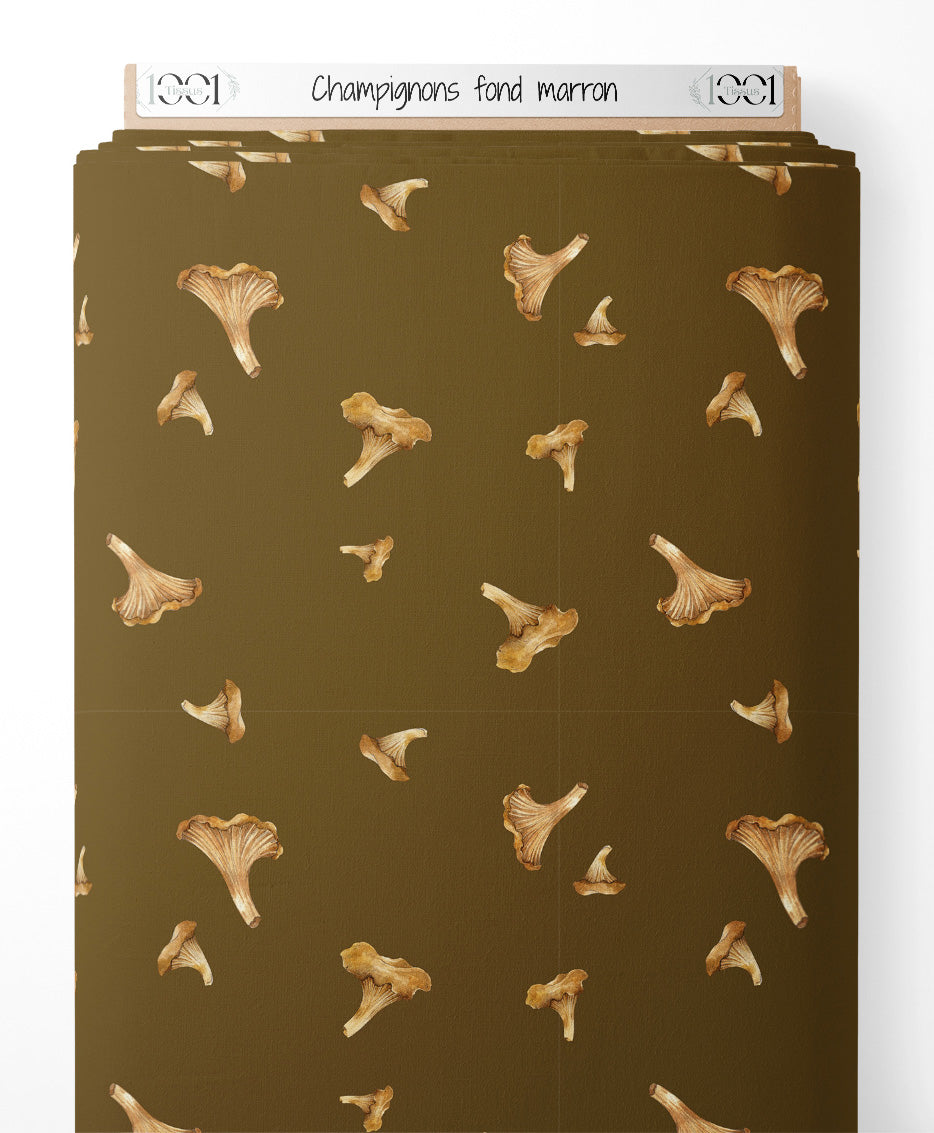 Tissu - Champignons sur fond marron