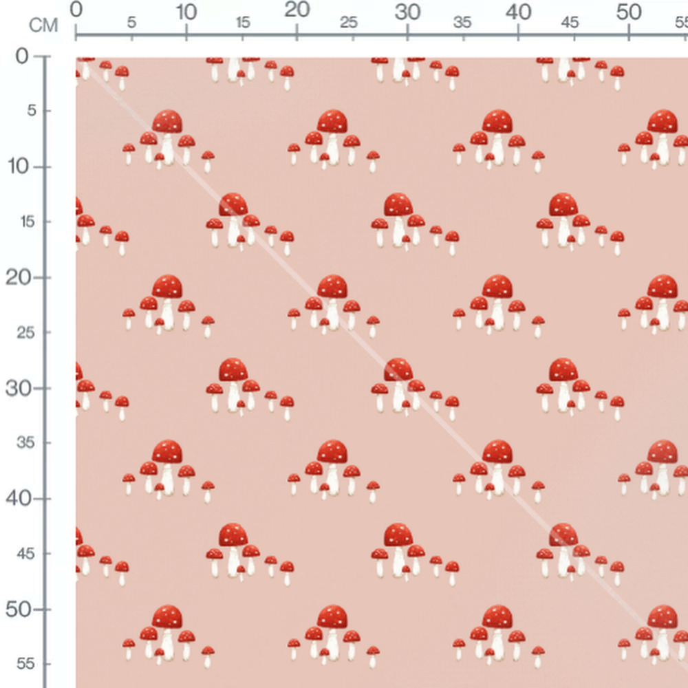 Les champignons sont de tailles variées et dispersés sur le fond. Le fond rose apporte une touche douce et chaleureuse.Les tissus