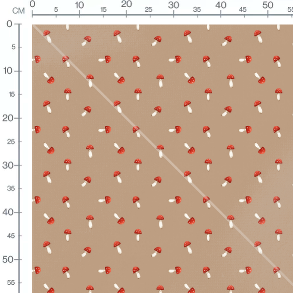 Les champignons ont des chapeaux rouges ornés de petits pois blancs. Le fond beige met en valeur les couleurs vives des champignons.Les tissus