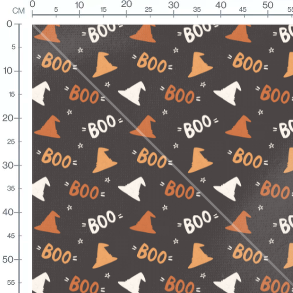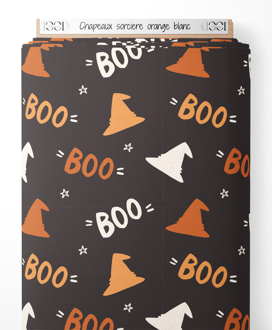 Les chapeaux de sorcière sont disposés de manière aléatoire. Le texte 'Boo' est écrit en grandes lettres. De petites étoiles blanches ajoutent une touche décorative.Les tissus
