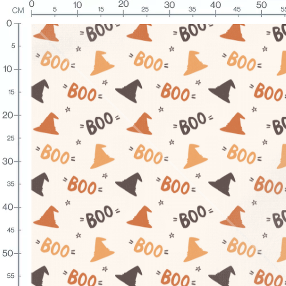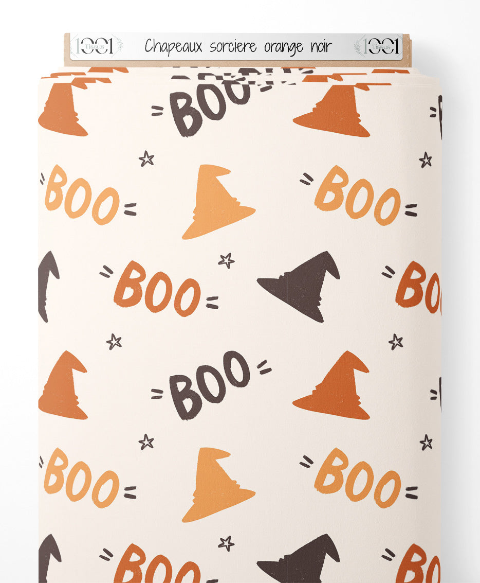 Les chapeaux de sorcière sont répartis en orange et noir. Le texte 'BOO' est écrit en grandes lettres orange et noires. De petites étoiles noires ajoutent un détail subtil au motif.Les tissus