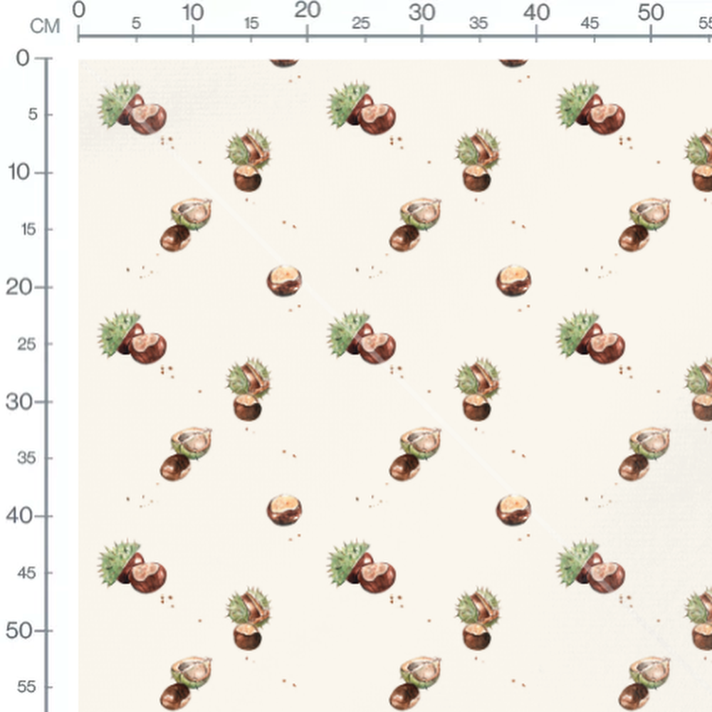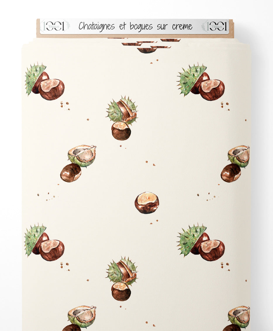 Les châtaignes sont partiellement ouvertes, révélant leur intérieur clair. Les bogues vertes sont hérissées de pointes. Des éclats marron ajoutent un effet de dispersion naturelle.Les tissus