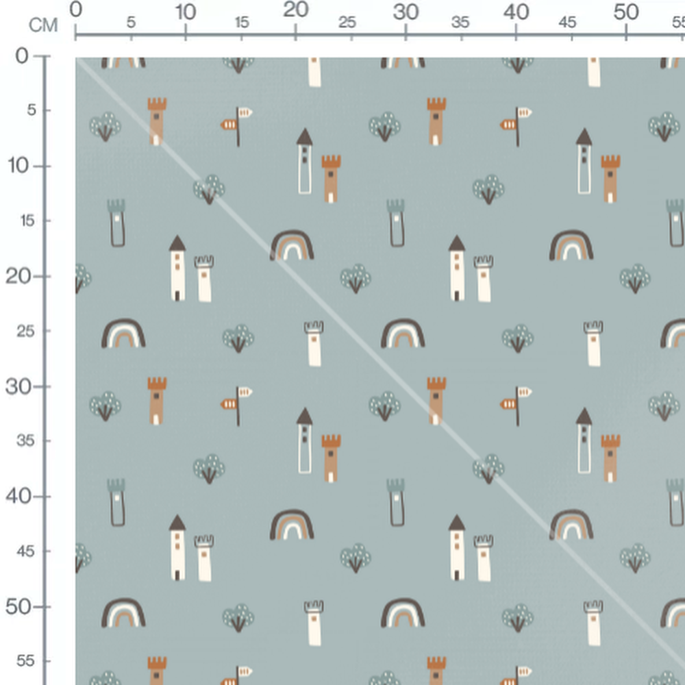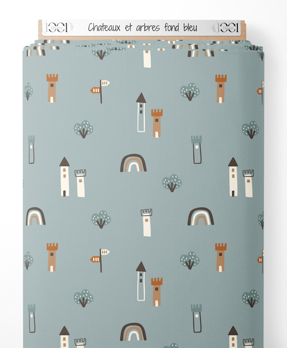 Les châteaux sont dessinés avec des tours de différentes hauteurs. Les arbres sont représentés avec des feuilles arrondies. Les arcs-en-ciel ajoutent une touche de couleur douce au motif.Les tissus
