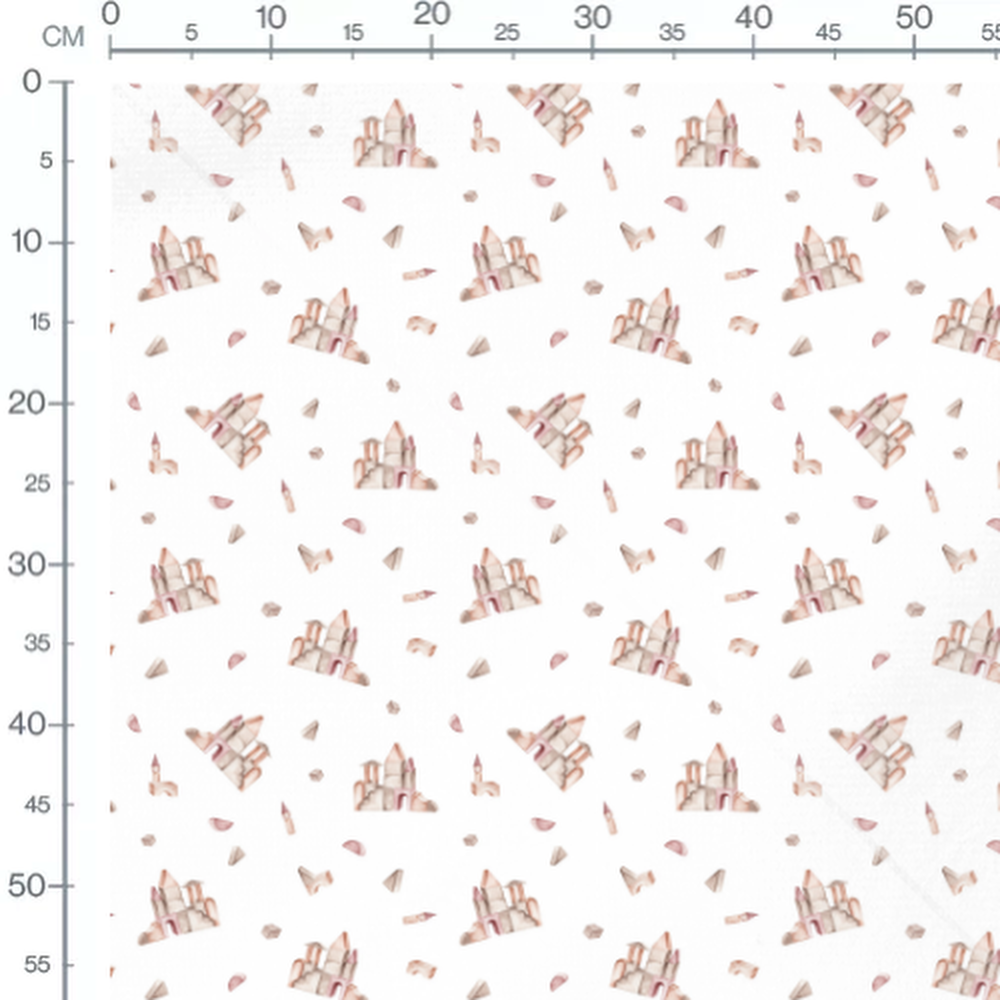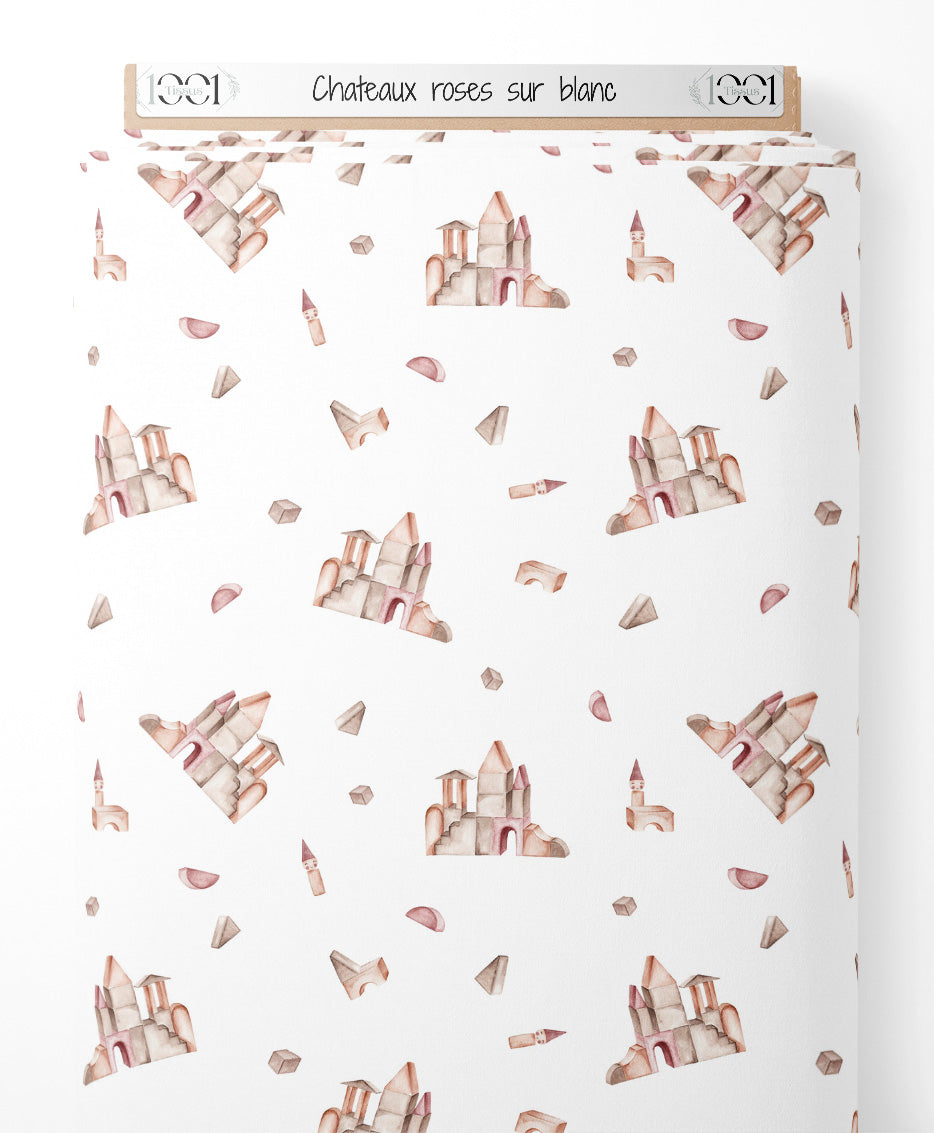 Les châteaux sont dessinés dans des tons doux de beige et de rose. Les formes géométriques incluent des cubes, des pyramides et des demi-cercles. Chaque élément est espacé sur un fond blanc uni.Les tissus