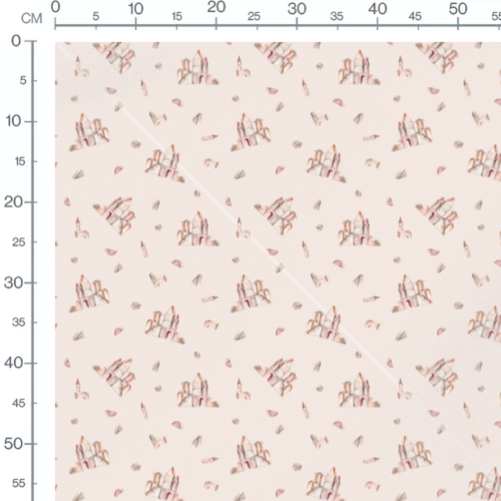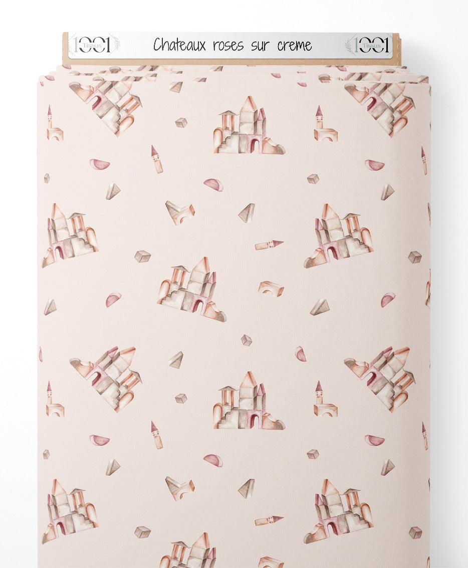 Les châteaux sont dessinés dans des tons doux de beige et de rose. Les formes géométriques incluent des cubes, des cônes et des demi-cercles dans des teintes similaires.Les tissus