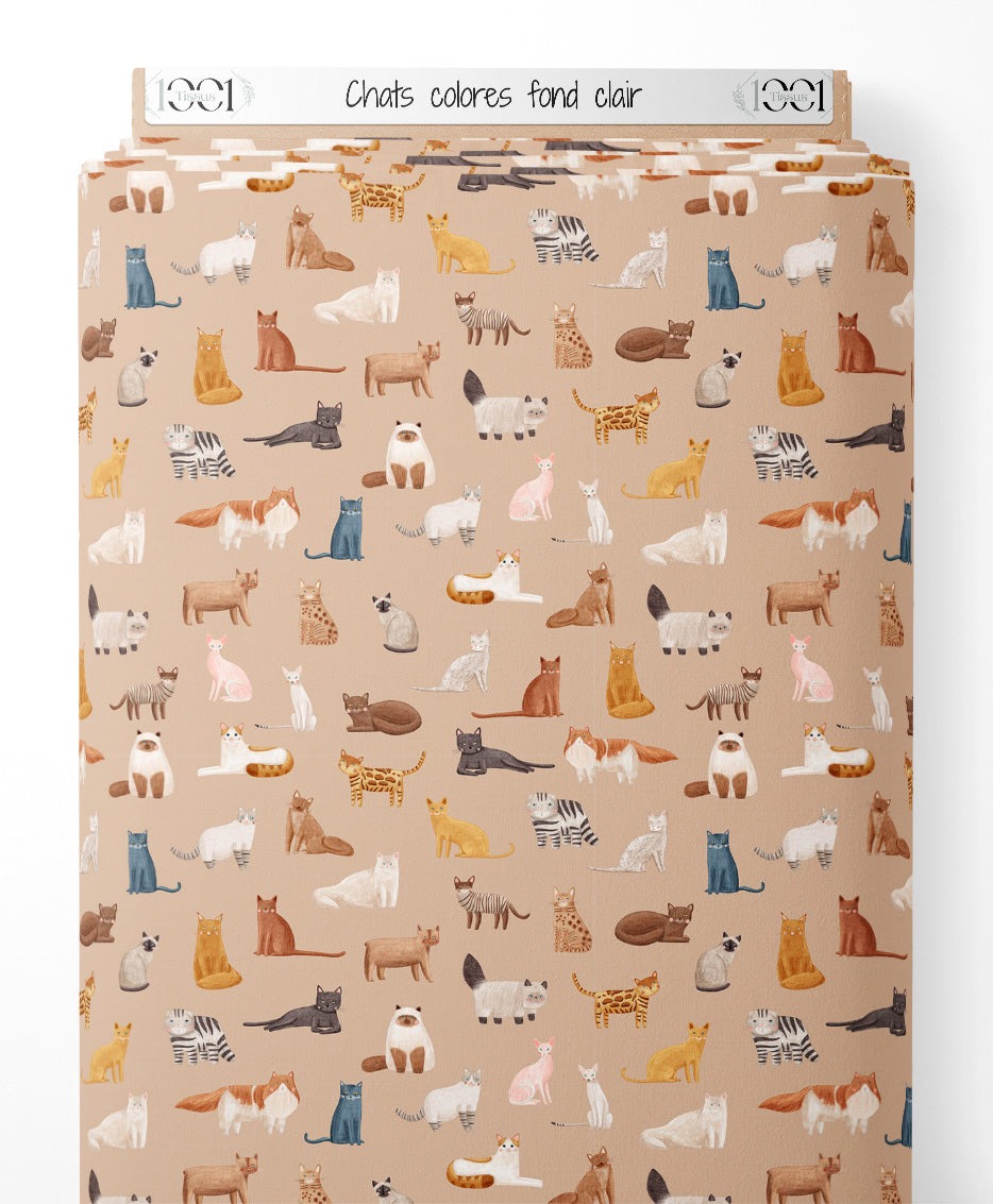 Certains chats sont assis tandis que d'autres sont couchés. Les chats présentent des motifs tigrés, unis ou tachetés. Quelques chats sont de couleur rose pâle, ajoutant une touche unique. Le fond beige met en valeur la diversité des couleurs des chats.Les tissus