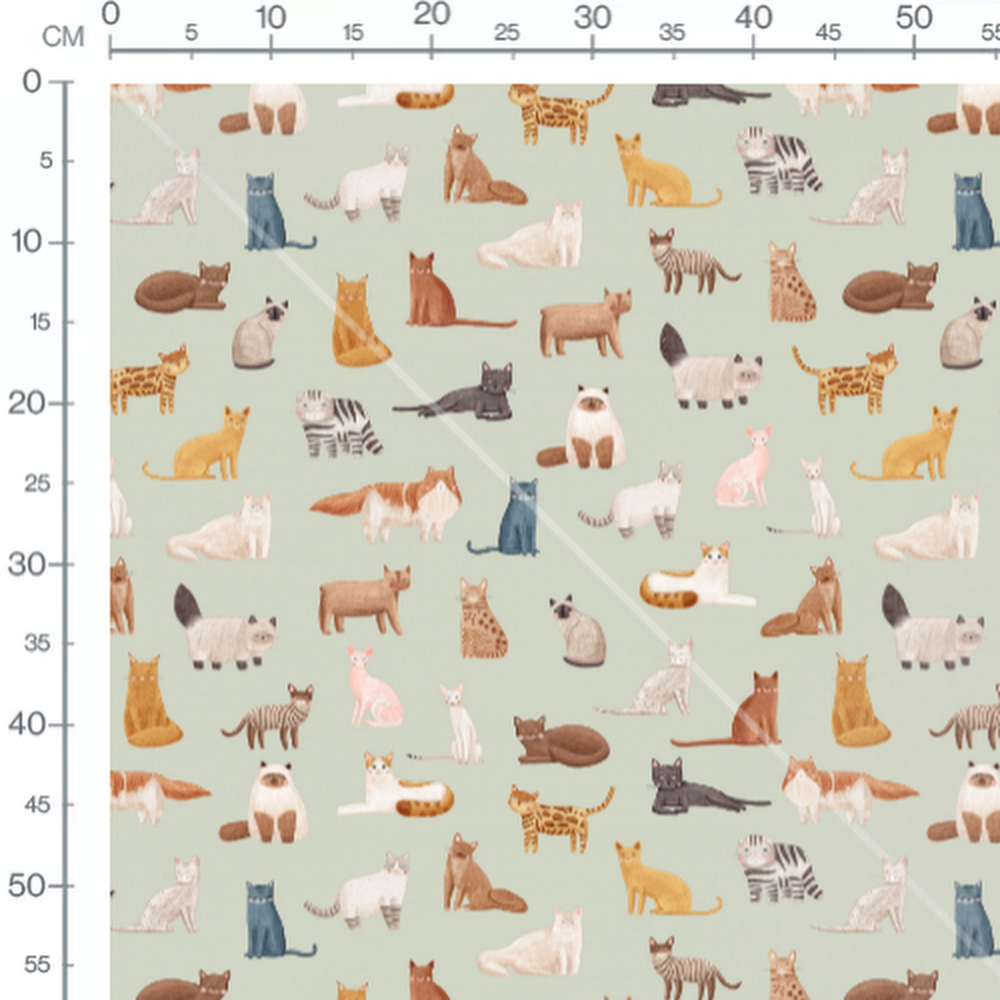 Certains chats ont des rayures, d'autres sont tachetés ou unis. Les chats sont assis ou couchés, chacun avec une expression unique.Les tissus