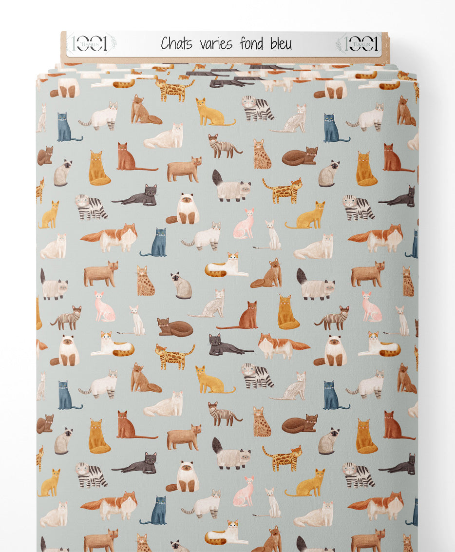 Les chats sont représentés dans des tons marron, gris, noir et blanc. Certains chats ont des motifs tigrés, d'autres sont unis ou bicolores. Le fond bleu clair met en valeur la diversité des chats. Chaque chat a une posture distincte, ajoutant de la variété au motif.Les tissus